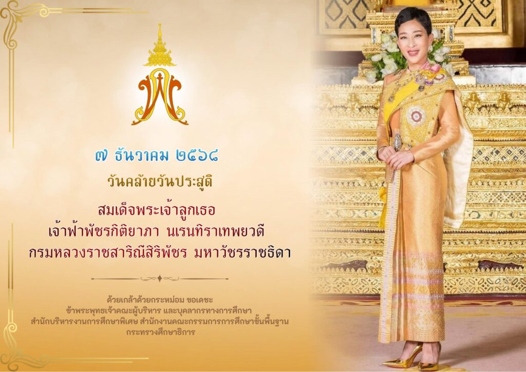 ๗ ธันวาคม ๒๕๖๘ วันคล้ายวันประสูติ สมเด็จพระเจ้าลูกเธอ เจ้าฟ้ากรมหลวงราชสาริณีสิริพัชร มหาวัชรราชธิดา ข่าวประชาสัมพันธ์ / By WORAWUT CH ๗ ธันวาคม ๒๕๖๘ วันคล้ายวันประสูติ สมเด็จพระเจ้าลูกเธอ เจ้าฟ้ากรมหลวงราชสาริณีสิริพัชร มหาวัชรราชธิดา ขอพระองค์ทรงพระเจริญยิ่งยืนนาน มีพระพลานามัยแข็งแรงสมบูรณ์ #สํานักบริหารงานการศึกษาพิเศษ #ศูนย์การศึกษาพิเศษ เขตการศึกษา ๙ จังหวัดขอนแก่น